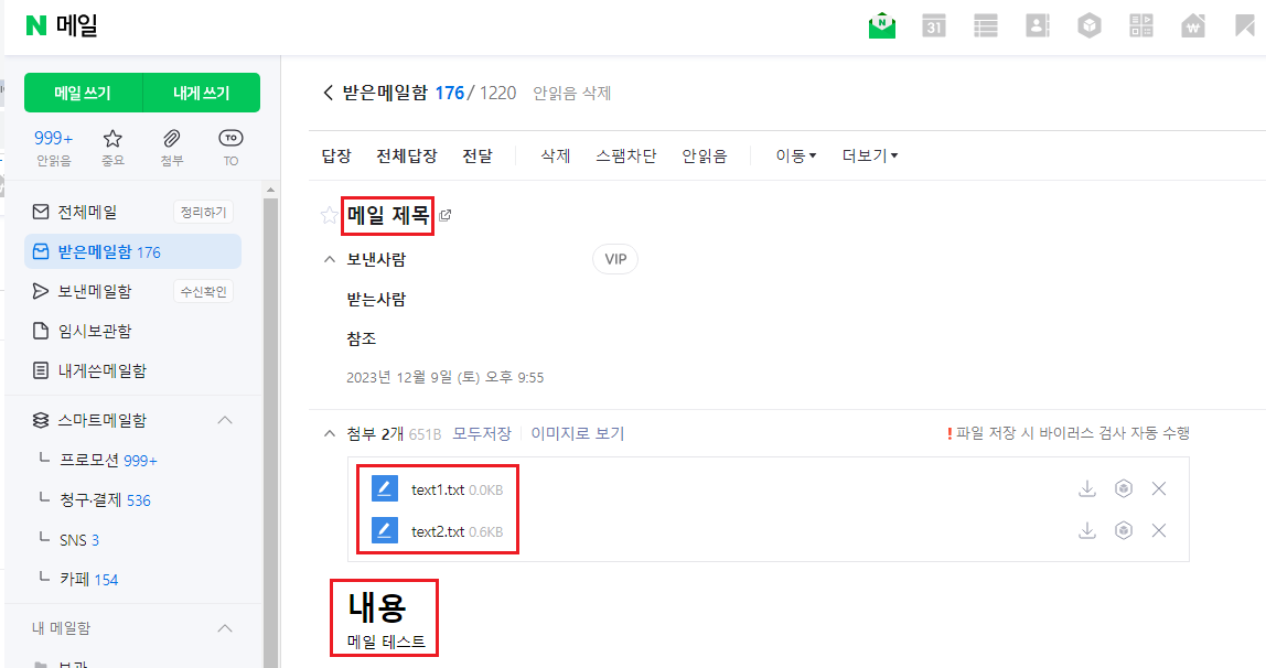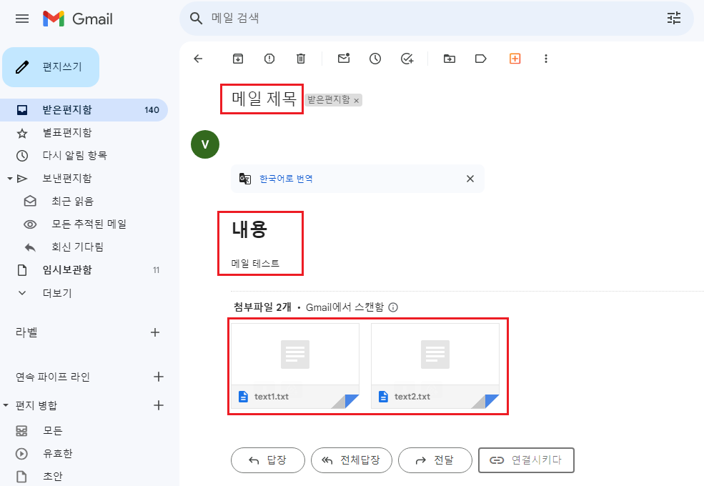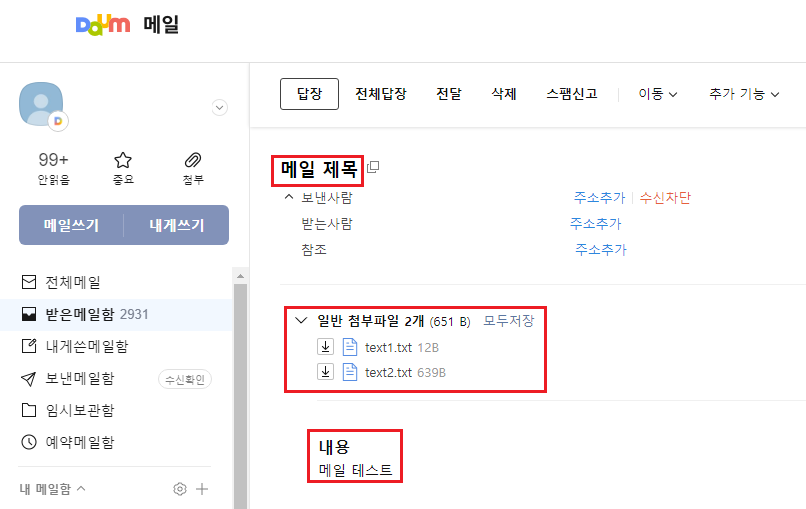 위의 경우 첨부 파일에는 text1.txt를 임시로 만들고 내용을 추가하였고