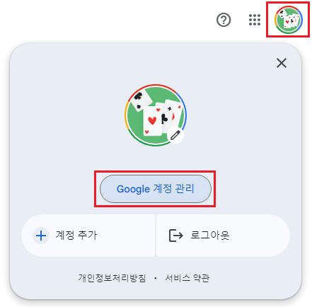 크롬에서 gmail 계정 로그인 후, 프로필을 클릭하고 Google 계정 관리 버튼을 누르자.