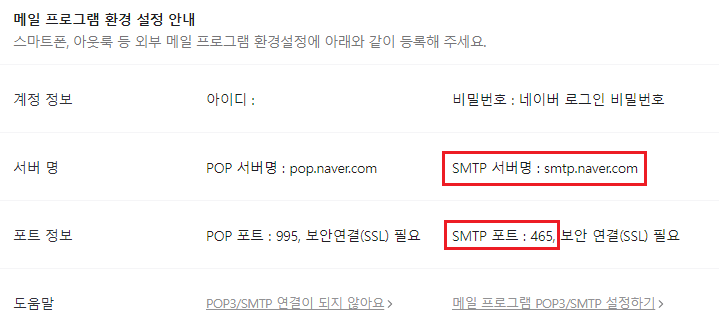 네이버 메일을 사용하기 위한 host와 port는 정해져 있다.