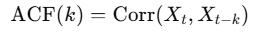 - 시계열 Xt가 k 시점(k lag) 떨어진 과거 값 Xt−k와 얼마나 상관되어 있는지 측정한 것