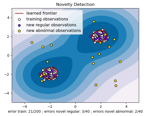 - LOF < 1 : 이웃보다 더 밀도 높은 구역 (test data가 cluster 내부에 깊게 위치)