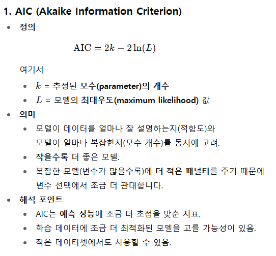 - AIC : 작은 샘플에서는 좋은 성능, 하지만 일치성은 보장되지 않음. → 과적합 경향