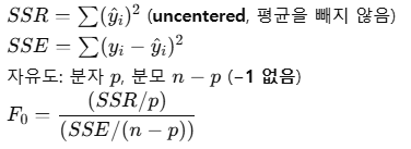 절편이 없는 회귀 모형의 경우는 SSR의 자유도가 달라지기 때문에 아래와 같이 공식이 변경된다.
