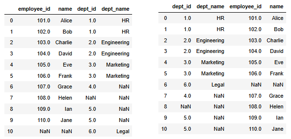 pd.merge(df_departments, df_employees, on='dept_id', how='outer')