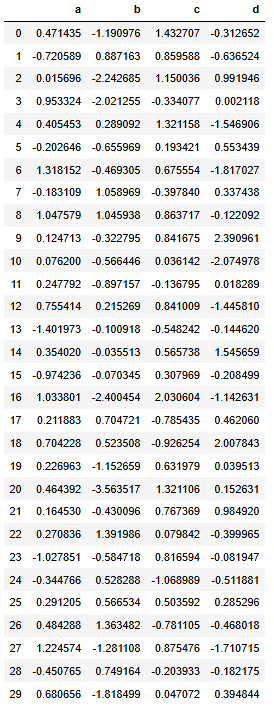 data = np.random.normal(loc=0, scale=1, size=(30, 4))