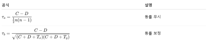 - 켄달의 타우는 동률인 데이터가 있을 때에도 적용할 수 있다.