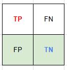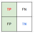 | Positive (실제) | TP | FN | TP + FN = 실제 양성인 데이터 TP / (TP + FN) = Recall → TPR ---------------------------------- FN / (TP + FN) → 제 2종 오류 β |