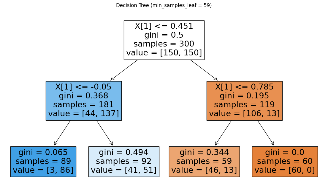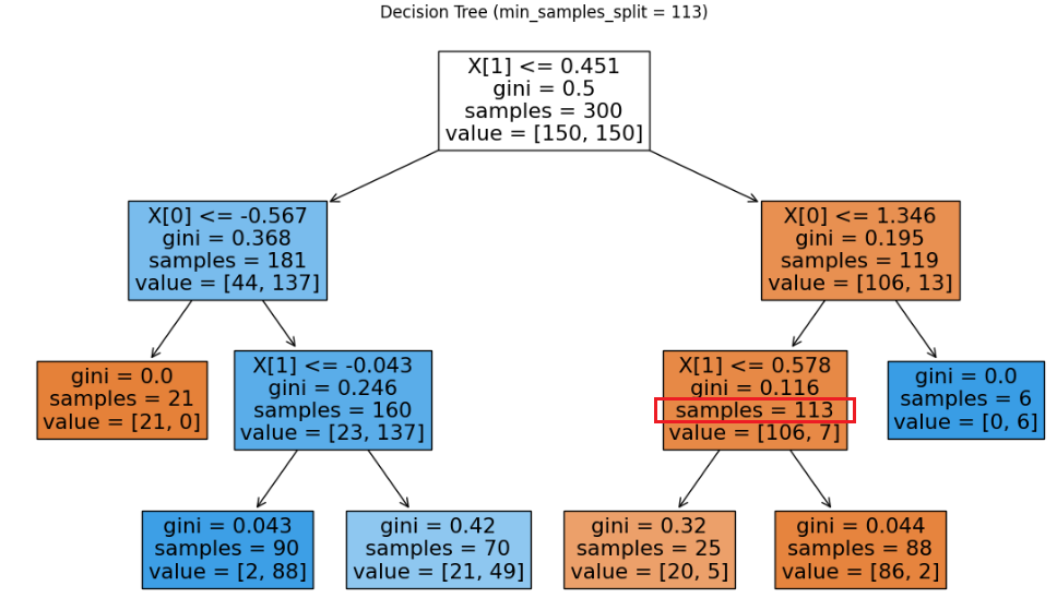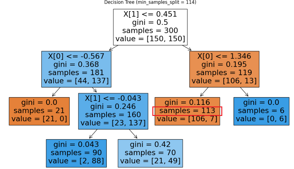 0.1로 낮출 경우, 모든 리프 노드가 전체 샘플 수의 10% 이상(30개)을 가지는 것을 알 수 있다.