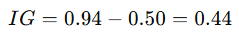 - 특정 feature로 분할했더니 자식 2개 엔트로피 가중평균 = 0.50이라면
