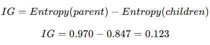 엔트로피가 0.123만큼 감소하게 되므로 어느 정도 좋은 분할이라고 할 수 있다.