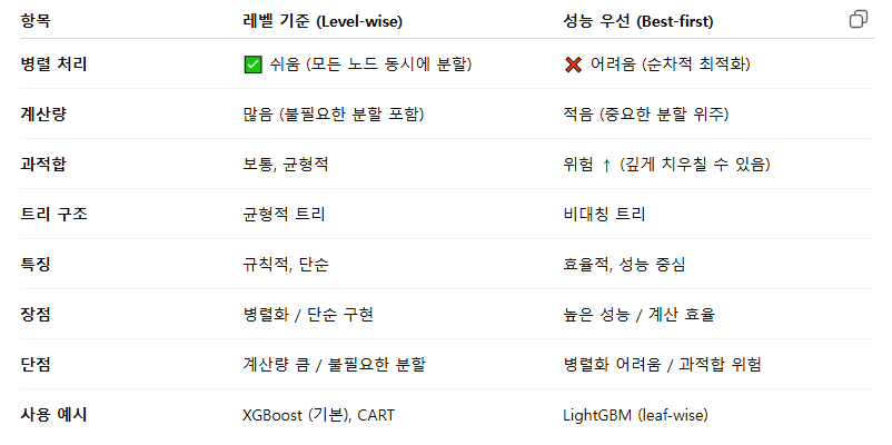- 모든 리프 후보 중 손실 감소(gain)가 가장 큰 노드부터 확장.