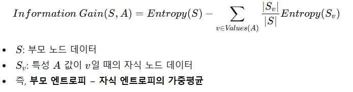 - 특정 특성(Feature)으로 분할했을 때 엔트로피가 얼마나 줄어드는지를 측정