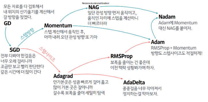 - 딥러닝 모델의 손실(loss)을 최소화하기 위해 가중치를 조금씩 조정하는 최적화 알고리즘