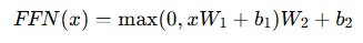 - 각 위치별로 독립적으로 선형 변환 + 비선형 변환(ReLU)