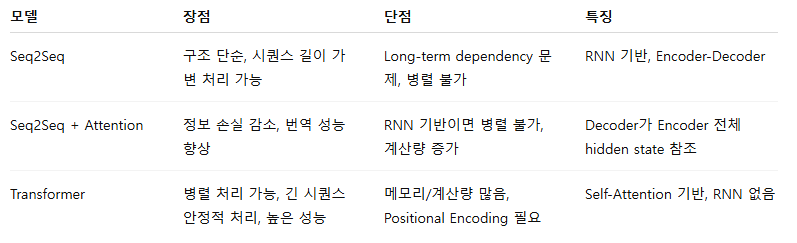 - Seq2Seq → 어텐션 → 트랜스포머: 점점 정보 병목과 연산 한계 개선
