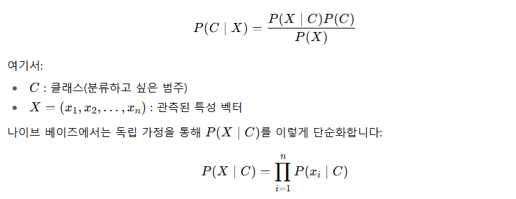 - 베이즈 정리를 기반으로 하고, 독립 가정(naive assumption)을 사용