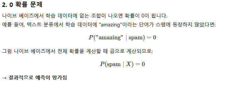 - 0 확률 문제(특정 클래스에 특정 특성이 없을 경우) 발생 가능 → 가법 평활화 필요