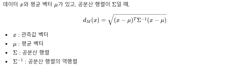 마할라노비스 거리가 크면 평균에서 멀리 떨어짐 → 일반적인 분포에서 벗어남