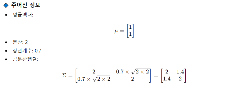 X, Y 평균이 1, 분산이 2이고 서로의 상관계수는 0.7일 때, 각 좌표와의 거리를 계산하시오.