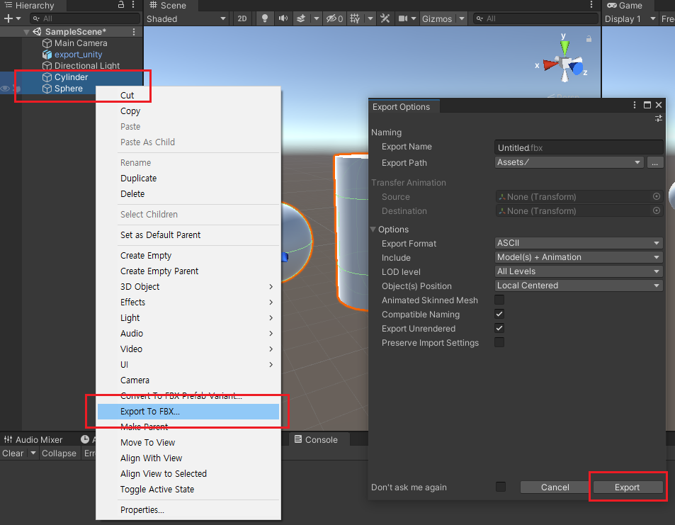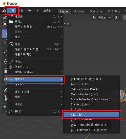 유니티 오브젝트를 블렌더로 내보내기 (export FBX)