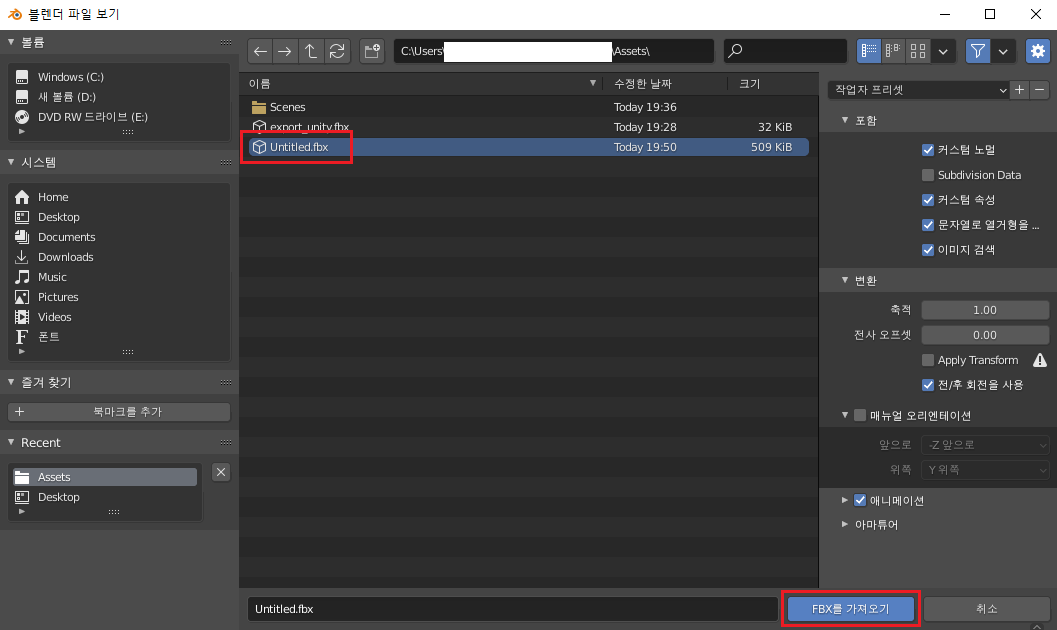 블렌더 오브젝트를 유니티로 내보내기 (export FBX)