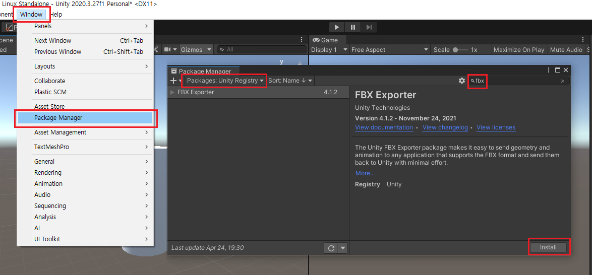 Window → Package Manager에서 Packages: Unity Registry를 선택 후, fbx를 검색하고 install 한다.
