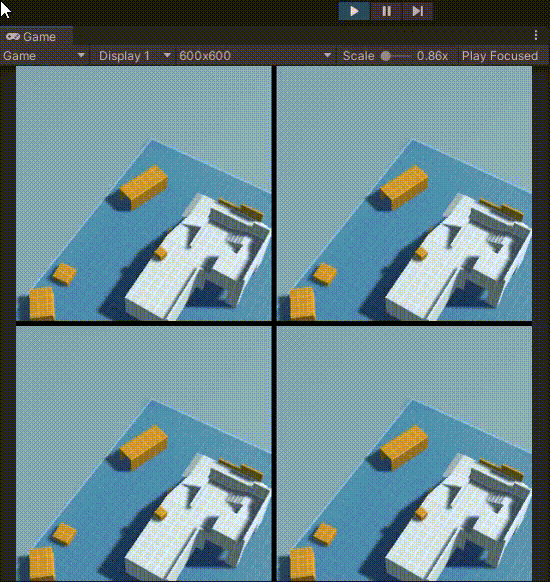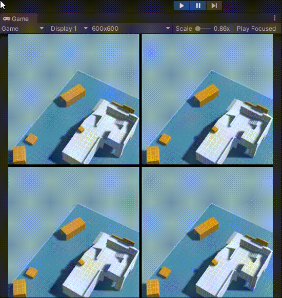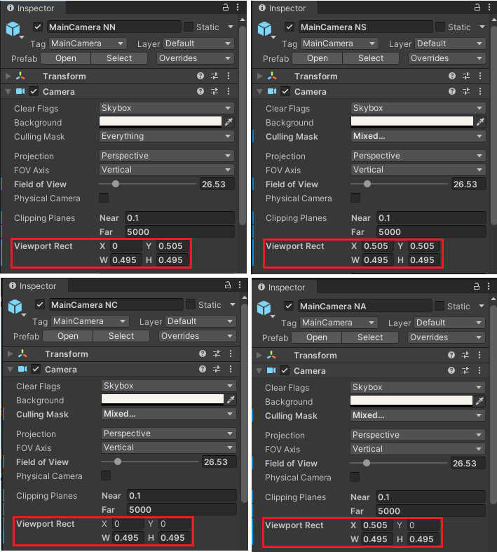 먼저 vCam1, 2를 각각 NN / NS / NC / NA로 설정한 씬을 만든 후 Open Scene Additive로 씬을 합친다.