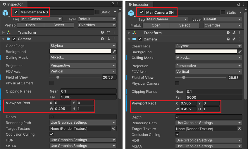 각각의 카메라에서 Viewport Rect를 다음과 같이 설정한다.